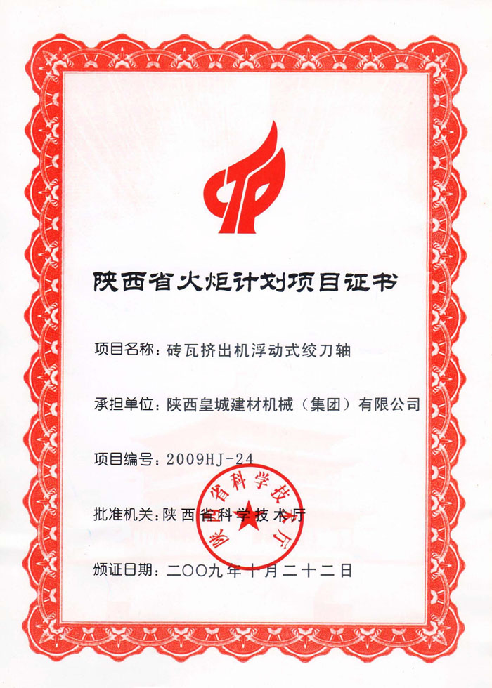 陜西省火炬計(jì)劃項(xiàng)目證書
